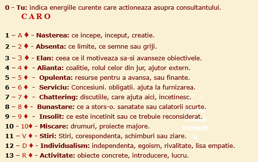Deci, atunci cand doriti mai multe informatii despre o zona (de exemplu, 2 of Hearts, "The Rings", pentru relatie si Regele Diamantelor, "Business", pentru munca), nu aveti continut pentru a efectua Cariera de 9 in jurul Harta "cu sens" oriunde s-ar afla, poti studia si ce card a cazut pe site-ul in cauza (exemplu: spatiul 41 pentru "Inelele", spatiul 13 pentru "Afacerea"). Aceasta va specifica fortele in actiune pe fiecare subiect.