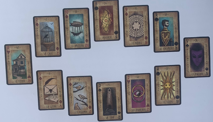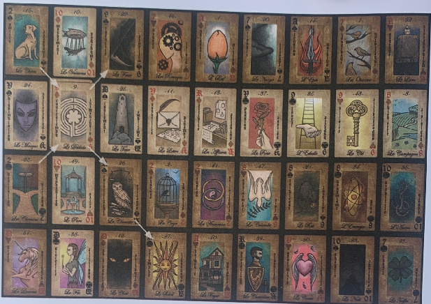 In ceea ce priveste Grand Tableau cu 36 de carti, folosirea unei placi este foarte interesanta, si deja va permite sa spuneti o poveste cu fiecare carte plasata, conform semnificatiilor fiecarei casete.>